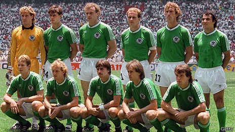 Η άλλη εκδοχή έχει να κάνει με την κατάσταση μετά τον Παγκόσμιο πόλεμο, τότε που καμία ομάδα δεν ήθελε να παίξει με τη Γερμανία. Η Ιρλανδία έσπασε αυτό το ιδιότυπο εμπάργκο το 1950 και έκτοτε η Γερμανία «υποστηρίζει» το πράσινο χρώμα με τη δεύτερη εμφάνισή της.