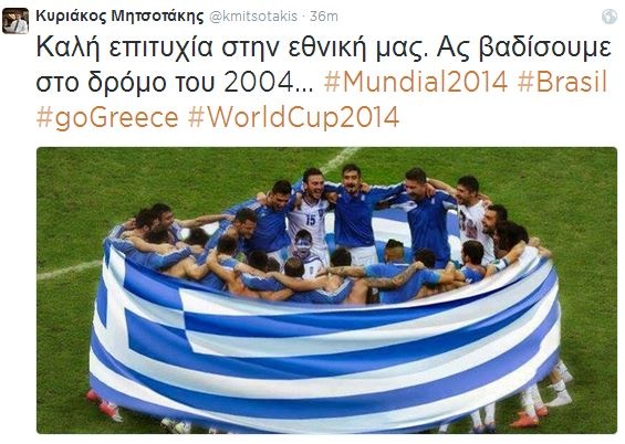 Με μήνυμά του στο twitter ο υπουργός Διοικητικής Μεταρρύθμισης, Κυριάκος Μητσοτάκης, ευχήθηκε καλή επιτυχία στην Εθνική Ελλάδος.