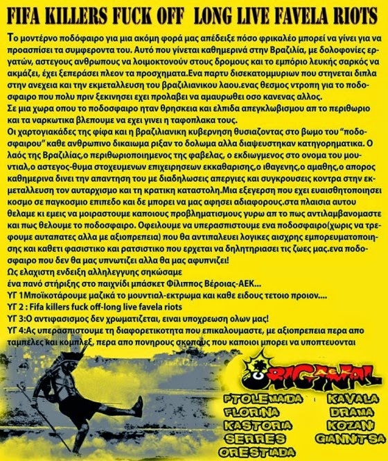 Οι χαρτογιακάδες της φίφα και η βραζιλιάνικη κυβέρνηση Θυσιάζοντας στο βωμό του «ποδοσφαίρου» κάθε ανθρώπινο δικαίωμα έριξαν το δόλωμα αλλά διαψεύστηκαν κατηγορηματικά. 0 λαός της Βραζιλίας,ο περιθωριοποιημένος της φαβέλας, ο εκδιωγμένος στο όνομα του μουντιάλ, ο άστεγος-θύμα στοχευμένων επιχειρήσεων εκκαθάρισης, ο ιθαγενής, ο αμαθής, ο άπορος καθημερινά δίνει την απάντηση του με διαδηλώσεις απεργίες και συγκρούσεις κόντρα στην εκμετάλλευση τον αυταρχισμό και τη κρατική καταστολή. Μια εξέγερση που έχει ευαισθητοποιήσει κόσμο σε παγκόσμιο επίπεδο και δε μπορεί να μας αφήσει αδιάφορους. Στα πλαίσια αυτού θέλαμε κι εμείς να μοιραστούμε κάποιους προβληματισμούς γύρω από το πως αντιλαμβανόμαστε και πως Θέλουμε το ποδόσφαιρο. Οφείλουμε να υπερασπιστούμε ένα ποδόσφαιρο (χωρίς να τρέφουμε αυταπάτες άλλα με αξιοπρέπεια) που Θα αντιπαλεύει λογικές αισχρής εμπορευματοποίησης και καθετί φασιστικό και ρατσιστικό που έρχεται να δηλητηριάσει τις ζωές μας. ένα ποδόσφαιρο που δεν θα μας υπνωτίζει αλλά θα μας αφυπνίζει!