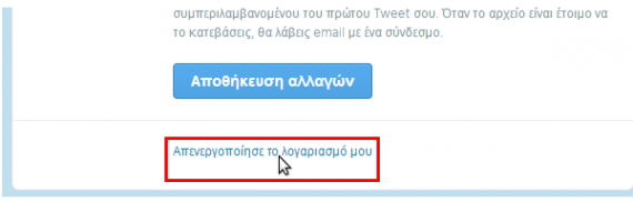 Το Twitter δεν ξεχωρίζει τη διαδικασία της απενεργοποίησης από τη διαγραφή λογαριασμού, όπως το Facebook.