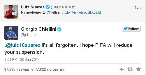 Από την πλευρά του ο Κιελίνι απάντησε μέσω του Twitter: «Έχουν όλα ξεχαστεί. Εύχομαι να μειώσει την ποινή σου η FIFA».