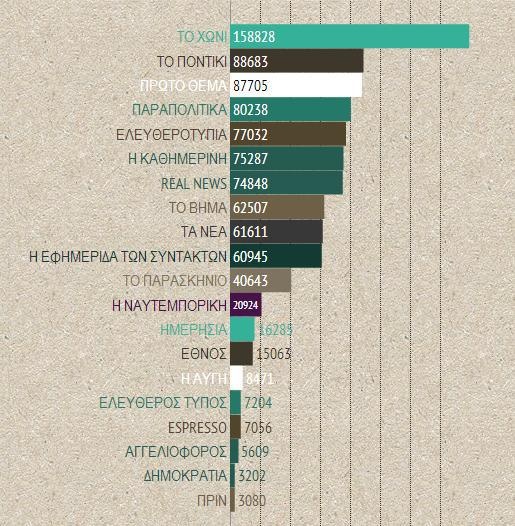 Η κατάταξη φέρνει στην πρώτη θέση μεταξύ των χρηστών του Facebook το «Χωνί» με 158.828 Likes. Στη δεύτερη θέση (από την τρίτη στην οποία βρισκόταν στις μετρήσεις του Ιουνίου) πέρασε το «Ποντίκι» με 88.683, αφήνοντας πίσω του το «Πρώτο Θέμα», το οποίο συγκεντρώνει 87.705 Likes. Στην τέταρτη θέση παραμένουν τα «Παραπολιτικά» με 80.238 και στην πέμπτη η «Ελευθεροτυπία» με 77.032 Likes. Ακολουθούν οι εφημερίδες «Καθημερινή» με 75.287 Likes, «Real News» με 74.848 Likes, «Το Βήμα» με 62.507 Likes, «Τα Νέα» με 61.611 Likes και στη δέκατη θέση η «Εφημερίδα των Συντακτών» με 60.945 Likes.
