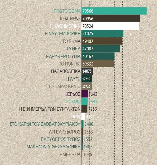 Σταθερά πρώτο στις προτιμήσεις των χρηστών του Twitter μεταξύ των εφημερίδων πανελλαδικής κυκλοφορίας και τον μήνα Ιούλιο βρίσκεται το «Πρώτο Θέμα», ο λογαριασμός του οποίου ακολουθείται από 79.566 followers. Στη δεύτερη θέση ανέβηκε η «Real News» με 70.956 followers, περνώντας την «Καθημερινή» (70.524). Στην τέταρτη θέση παραμένει η εφημερίδα «Ναυτεμπορική» με 51.075 followers και στην πέμπτη το «Βήμα» με 49.402. Ακολουθούν τα «Νέα» με 47.087 followers, η «Ελευθεροτυπία» με 40.167 followers, το «Ποντίκι» με 39.355 followers και τα «Παραπολιτικά» με 14.075 followers, ενώ στο Top10 μπήκε η «Αυγή» με 12.710 followers.