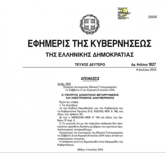Εγκρίνουμε την λειτουργία του Εθνικού Τυπογραφείου το Σάββατο 5 και Κυριακή 6 Ιουλίου 2014 λόγω εκτάκτων υπηρεσιακών αναγκών.