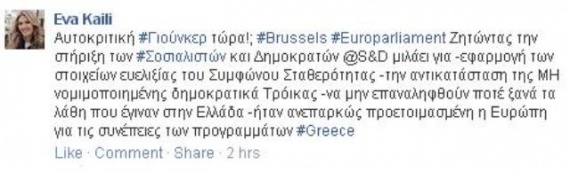 Μπορεί πλέον να είναι ευρωβουλευτής, ωστόσο η Εύα Καϊλή δεν ξεχνά τη δημοσιογραφική της ιδιότητα. Η ίδια ανήρτησε στα social media μια φωτογραφία Ζαν Κλοντ Γιούνκερ, ο οποίος μιλώντας στην ομάδα των Σοσιαλιστών έκανε την αυτοκριτική του και έκανε λόγο για μη νομιμοποιημένη δημοκρατικά τρόικα και για τα λάθη που έγιναν στην Ελλάδα.