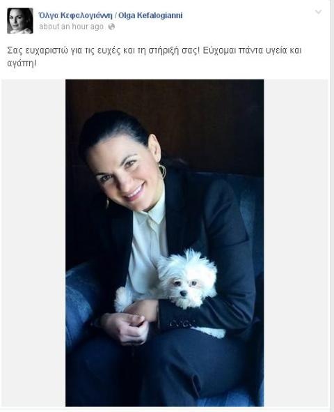 Η Όλγα Κεφαλογιάννη με συντηρητικό στυλ, φορώντας πουκάμισο κλειστό έως το λαιμό (η αλήθεια είναι ότι μας έχει συνήθισει σε πιο ανοιχτό ντεκολτέ) κρατά αγκαλιά το σκυλί της και αντεύχεται: