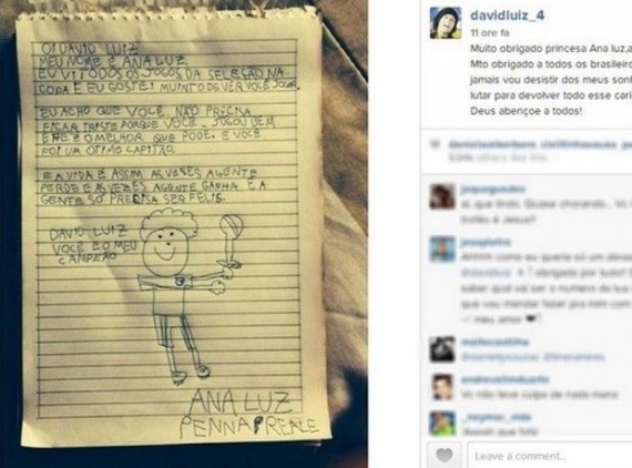 «Είδα όλα τα παιχνίδια της Βραζιλίας. Πιστεύω ότι δεν πρέπει να είσαι στενοχωρημένος επειδή έπαιξες καλά, έδωσες τον καλύτερο εαυτό σου και ήσουν ένας σούπερ αρχηγός. Έτσι είναι η ζωή, μερικές φορές κερδίζεις, μερικές φορές χάνεις. Όμως οι άνθρωποι πρέπει να σκέφτονται κυρίως το πώς θα παραμένουν ευτυχισμένοι. Νταβίντ Λουίζ, παραμένεις ο πρωταθλητής μου» γράφει η 9χρονη.