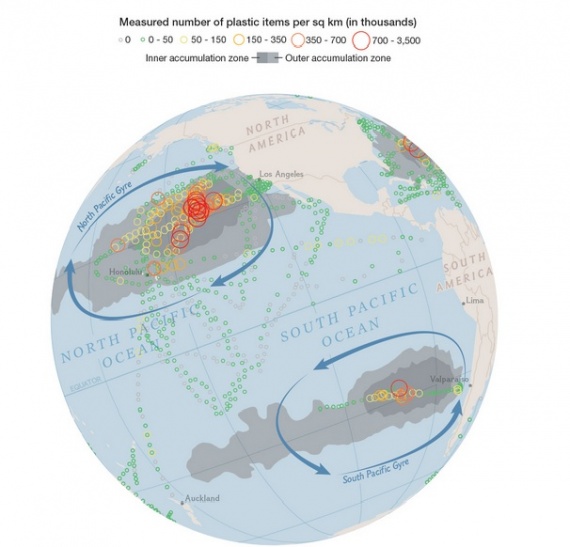 Η εργασία τους, που δημοσιεύθηκε αυτό το μήνα στα Πρακτικά της Εθνικής Ακαδημίας Επιστημών, ανέδειξε εκατομμύρια κομμάτια των πλαστικών απορριμμάτων να επιπλέουν σε πέντε μεγάλους κυκλώνες στους ωκεανούς του κόσμου.