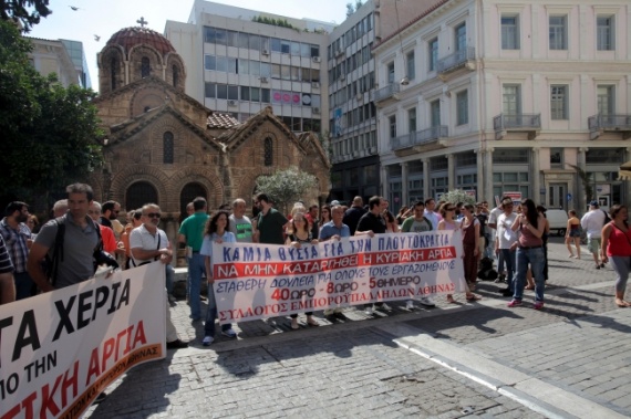 Την αντίθεσή τους στο μέτρο εξέφρασαν με ξεχωριστή συγκέντρωση και πορεία διαμαρτυρίας στο κέντρο της Θεσσαλονίκης μέλη του Σωματείου Υπαλλήλων Βιβλίου και Χάρτου, του Δικτύου Ανέργων και Επισφαλώς Εργαζομένων, και της Ελευθεριακής Συνδικαλιστικής Ένωσης.
