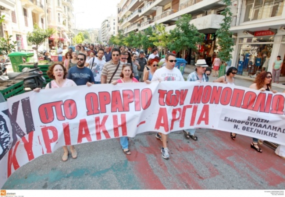 Στη Θεσσαλονίκη, συγκέντρωση στην πλατεία Αριστοτέλους και πορεία σε κεντρικές οδούς της πόλης πραγματοποίησαν μέλη της Ένωσης Εμποροϋπαλλήλων Θεσσαλονίκης σε ένδειξη διαμαρτυρίας για τη λειτουργία των καταστημάτων τις Κυριακές.