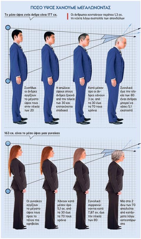 Παράλληλα οι στατιστικές δείχνουν ότι από τα 30 έως τα 70 της χρόνια μία μέση γυναίκα κονταίνει κατά 5,1 εκατοστά, απώλεια που θα υπερβεί τα 7,8 εκατοστά όταν γίνει 80 ετών. Αντιθέτως στους άνδρες το ύψος μειώνεται συνήθως κατά 3 εκατοστά έως τα 70 τους χρόνια και έως 5,1 εκατοστά μέχρι την ηλικία των 80.
