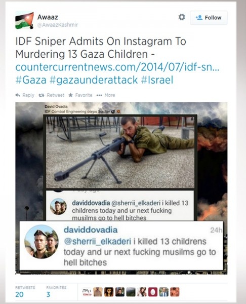 Στην ομολογία ότι σκοτώνει παιδιά και το απολαμβάνει, προχώρησε στρατιώτης του Ισραήλ σε ανάρτησή του στα social media. Ο Ντέιβιντ Οβάντια ελεύθερος σκοπευτής του ισραηλινού στρατού ανάρτησε φωτογραφία στο instagram και έγραψε ότι «Σήμερα σκότωσα 13 παιδιά και εσείς είστε οι επόμενοι γαμ… μουσουλμάνοι πηγαίνετε στο διάολο σκύλες».