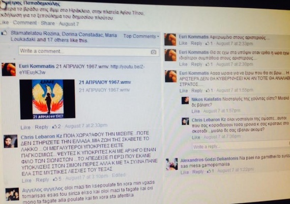 Συγκεκριμένα στις 7 Αυγούστου και σε ανάρτηση του Δημήτρη Παπαδημούλη, με την οποία καλούσε σε ανοικτή συγκέντρωση τους κατοίκους του Ηρακλείου στην Πλατεία Αγίου Τίτου, ο Κομμάτης, που χρησιμοποιούσε στον λογαριασμό του το ψευδώνυμο «Euri Kommatis», πόσταρε τον ύμνο της 21ης Απριλίου «αφιερωμένο εξαιρετικά στους αριστερούς», όπως διευκρίνιζε.