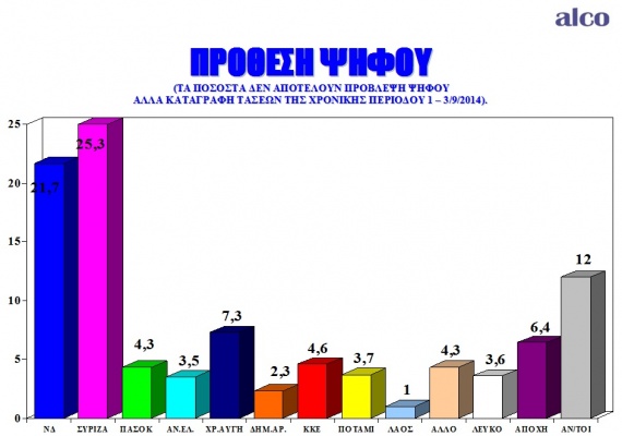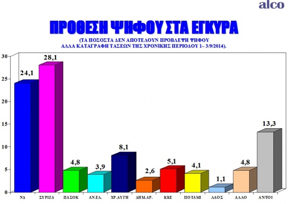 Προβάδισμα του ΣΥΡΙΖΑ κατά 4% στην αναγωγή της πρόθεσης ψήφου και κατά 3,6% στην πρόθεση ψήφου, καταγράφει μεγάλη δημοσκόπηση της εταιρίας ALCO που παρουσιάζεται στο «Ποντίκι» που κυκλοφορεί την Πέμπτη 4/9.