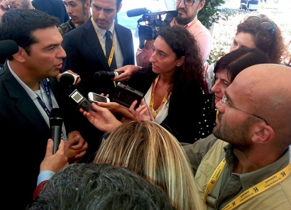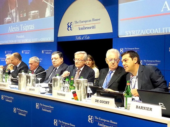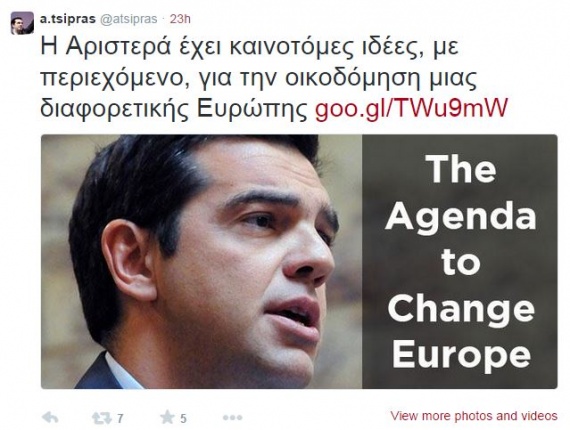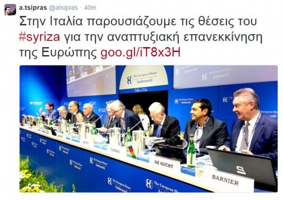 Νωρίτερα, πρόεδρος του ΣΥΡΙΖΑ, μέσω του προσωπικού του λογαριασμού στο Twitter ανέβασε μια φωτογραφία από την έναρξη των διαδικασιών του συνεδρίου, με τη λεζάντα: «Στην Ιταλία παρουσιάζουμε τις θέσεις του #syriza για την αναπτυξιακή επανεκκίνηση της Ευρώπης». Στη φωτογραφία μάλιστα φαίνεται να κάθεται δίπλα στον πρώην πρωθυπουργό της Ιταλίας Μάριο Μόντι, τον Επίτροπο Εμπορίου Κάρελ ντε Γκουχτ και τον αντιπρόεδρο του Ευρωπαϊκού Λαϊκού Κόμματος, Μισέλ Μπαρνιέ, ενώ στη φωτογραφία διακρίνεται και ο Μανουέλ Μπαρόζο.