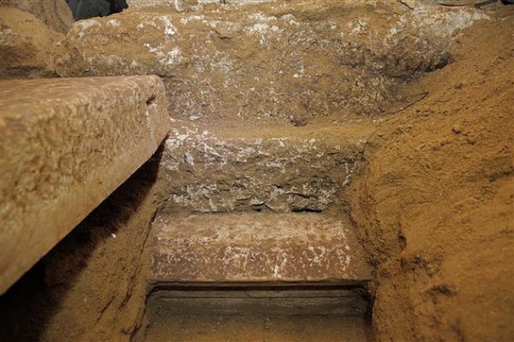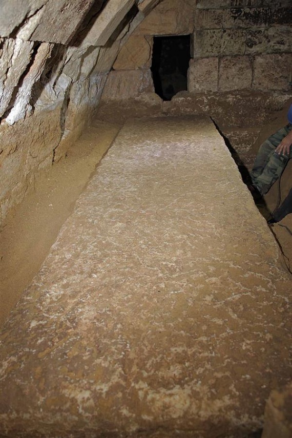 Την Παρασκευή 5 Σεπτεμβρίου, απομακρύνθηκαν τα χώματα, πίσω από τον δεύτερο διαφραγματικό τοίχο, προκειμένου να εξισορροπηθούν οι γεωστατικές ωθήσεις των γαιών μεταξύ των δύο χώρων. Με την αφαίρεση των χωμάτων αποκαλύφθηκε, σε απόσταση 2 περίπου μέτρων από τη θόλο και 4,5 μέτρων, περίπου, από το δάπεδο, μαρμάρινη ορθογώνια πλάκα, μήκους 4.2μ, πλάτους 1μ. και πάχους 0.21μ, σε άριστη κατάσταση. Εδράζεται οριακά σε πώρινο λίθο του τρίτου διαφραγματικού τοίχου και στο ανώτερο τμήμα ορθομαρμάρωσης, το οποίο φέρει κυμάτιο. Στο κάτω μέρος της πλάκας υπάρχει γραπτός διάκοσμος σε γαλάζιο, κόκκινο και κίτρινο χρώμα, όπου παριστάνονται φατνώματα με ρόδακα στο κέντρο. Πρόκειται για τμήμα της οροφής του συγκεκριμένου χώρου.