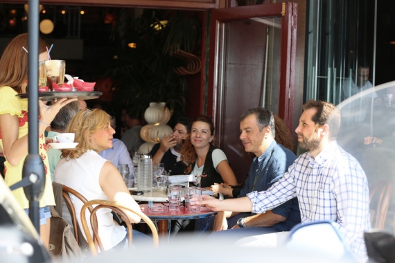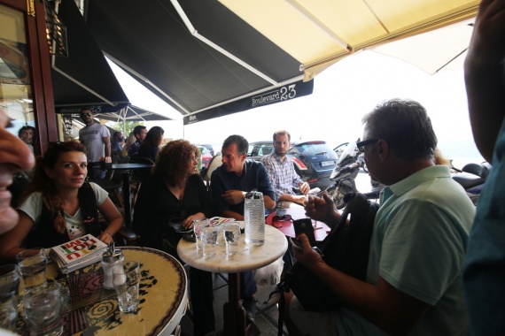 Σε χαλαρή διάθεση, όπως φαίνεται από τις φωτογραφίες, ο Σταύρος Θεοδωράκης απολαμβάνει τον καφέ του μαζί με τους συνεργάτες σε ένα από τα πιο ιστορικά μαγαζιά της πόλης με θέα το Θερμαϊκό, αμέσως μετά την ομιλία του στη ΔΕΘ.