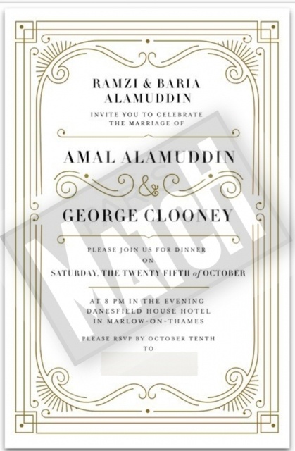 Ιδιαίτερο απλό με χρυσαφί λεπτομέρειες και καμπύλες είναι το προσκλητήριο του Τζορτζ Κλούνει και της Αμάλ Αλαμουντίν για το γαμήλιο δείπνο μετά τη θρησκευτική τελετή.