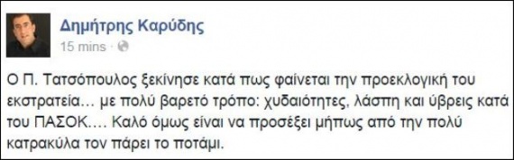 «Ο Π. Τατσόπουλος ξεκίνησε κατά πως φαίνεται την προεκλογική του εκστρατεία… με πολύ βαρετό τρόπο: χυδαιότητες, λάσπη και ύβρεις κατά του ΠΑΣΟΚ…. Καλό όμως είναι να προσέξει μήπως από την πολύ κατρακύλα τον πάρει το ποτάμι»