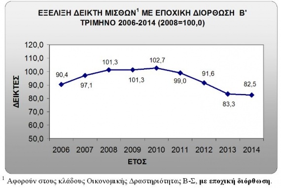 Το δεύτερο τρίμηνο του 2014 ο δείκτης των μισθών μειώθηκε κατά 1,4%, παρουσιάζοντας επιβράδυνση σε σχέση με το ίδιο διάστημα του 2013, όταν η μείωση έφθανε το 7,4%.