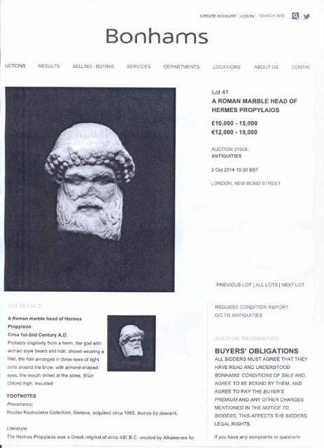 Σύμφωνα με το υπουργείο Πολιτισμού, σε έλεγχο της Διεύθυνσης Τεκμηρίωσης και Προστασίας Πολιτιστικών Αγαθών την πρώτη ημέρα ανάρτησης (10-09-2014) του ηλεκτρονικού καταλόγου της δημοπρασίας που πρόκειται να πραγματοποιηθεί στο Λονδίνο στις 2 Οκτωβρίου 2014 (Auction 21928, Antiquities), στον ιστότοπο του Οίκου Δημοπρασιών Bonhams διαπιστώθηκε ότι στα προς δημοπράτηση αντικείμενα περιλαμβάνεται και μαρμάρινη κεφαλή Ερμή.