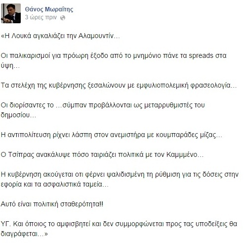 Με ανάρτησή του στο προσωπικό του προφίλ στο facebook, τιτλοφορούμενο «Τι είναι πολιτική σταθερότητα;», ο κ. ΜωραΪτης αναφέρει: