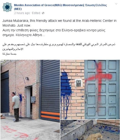 Η Μουσουλμανική Ένωση Ελλάδος γράφει στην προσωπική της σελίδα στο facebook: «Αυτή την επίθεση φιλίας δεχτήκαμε στο Ελληνο-αραβικό κέντρο μόλις σήμερα. Καληνύχτα Αθήνα…».