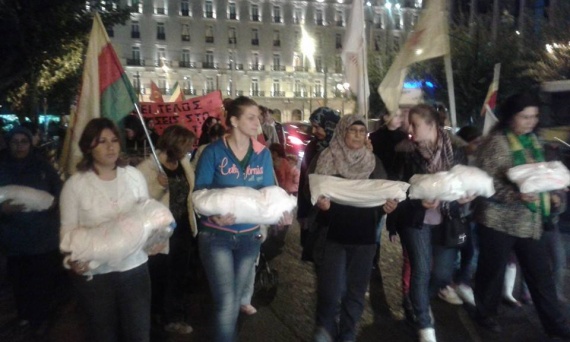 Κρατώντας στα χέρια τους παιδικές κούκλες τυλιγμένες σε σάβανα, Κούρδισες οι οποίες ζουν στην Αθήνα θέλησαν να εκφράσουν τη διαμαρτυρία τους για την παθητική στάση της Παγκόσμιας Κοινότητας μπροστά στη σφαγή που συντελείται τις 20 τελευταίες ημέρες στην πολύπαθη πόλη της Βόρειας Συρίας.