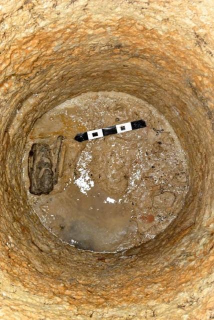 Βρισκόταν εντός στρώματος γκρίζας λάσπης με αρκετή λατύπη, εντός του υδροφόρου ορίζοντα, που εμπεριείχε κεραμική και τμήματα αγγείων που χρονολογούνται στο τέλος της ελληνιστικής περιόδου (100-86 π.Χ.), μαζί με άλλα οικιστικά κατάλοιπα (κεράμους, μεταλλικά αντικείμενα και άλλα τεμάχια ξύλων μικρών διαστάσεων).