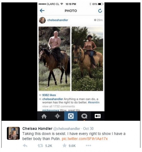 Να μιμηθεί τον Βλαντιμίρ Πούτιν, θέλησε η Τσέλσι Χάντλερ, μια από τις πλέον γνωστές παρουσιάστριες της Αμερικής και φωτογραφήθηκε ημίγυμνη πάνω σε ένα άλογο όπως είχε κάνει και ο πρόεδρος της Ρωσίας.