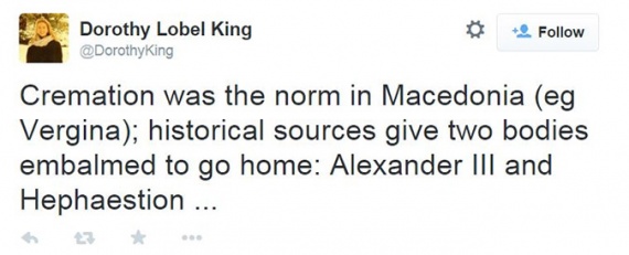 Η Κινγκ έγραψε, μεταξύ άλλων, στο Twitter ότι στην αρχαία Μακεδονία η αποτέφρωση των νεκρών ήταν ο κανόνας, σημειώνοντας ότι τότε ήταν διαφορετική η διαδικασία της καύσης, με αποτέλεσμα να παραμένουν ακέραια ορισμένα οστά και μέρη των σωμάτων.