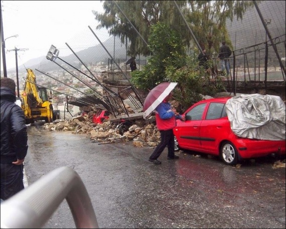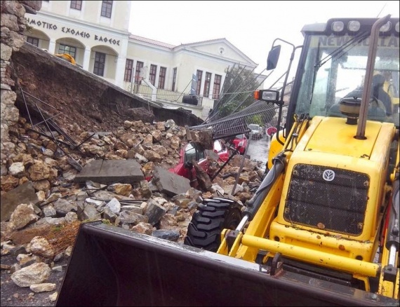Καταστροφές προκάλεσε η ισχυρή καταιγίδα που χτύπησε την περιοχή της Σάμου. Ο τοίχος του δημοτικού σχολείου στο Άνω Βαθύ κατέρρευσε και πλάκωσε μια μοτοσικλέτα και τρία αυτοκίνητα. Ωστόσο, δεν έχουν αναφερθεί τραυματίες, σύμφωνα με το Samos News World.