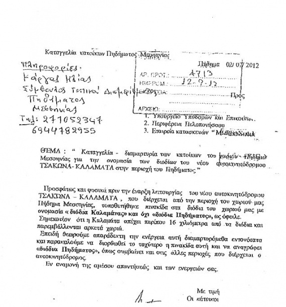 Σας παρουσιάζουμε αυτολεξεί την «Καταγγελία – διαμαρτυρία των κατοίκων του χωριού Πήδημα Μεσσηνίας για την ονομασία των διοδίων του νέου αυτοκινητόδρομου Τσακώνα – Καλαμάτα», όπως κατατέθηκε πριν από δύο χρόνια στο υπουργείο Υποδομών, στην Περιφέρεια Πελοποννήσου και στην εταιρεία Μορέας:
