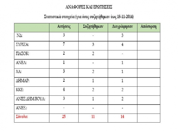 Από την έναρξη των εργασιών της Ολομέλειας της Βουλής, στις 6 Οκτωβρίου έως τις 17 Νοεμβρίου 2014, είχαν κατατεθεί 156 επίκαιρες ερωτήσεις. Εξ αυτών συζητήθηκαν 66 (ποσοστό 42%) ενώ διεγράφησαν 81, επτά (7) τέθηκαν στο αρχείο και δύο (2) αποσύρθηκαν (ποσοστό 58%). Το ίδιο παρατηρείται και στις αναφορές – ερωτήσεις. Είχαν κατατεθεί 25 αιτήσεις, συζητήθηκαν 11, διεγράφησαν 14.