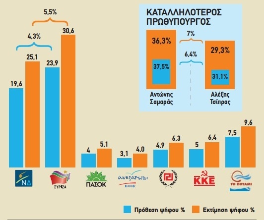 Συγκεκριμένα, ο ΣΥΡΙΖΑ συγκεντρώνει ποσοστό 23,3% ενώ η Νέα Δημοκρατία βρίσκεται στο 18,6%