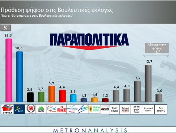 Προβάδισμα 4,7 μονάδων στον ΣΥΡΙΖΑ στην πρόθεση ψήφου δίνει και το εβδομαδιαίο βαρόμετρο της Metron Analysis για την εφημερίδα ΠΑΡΑΠΟΛΙΤΙΚΑ.