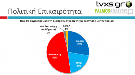Σε σχέση με τα ζητήματα της πολιτικής επικαιρότητας το 49% των ερωτώμενων θεωρεί «ανύπαρκτη» την διαπραγμάτευση της Κυβέρνησης με την τρόικα. Το 20% πιστεύει ότι η διαπραγμάτευση είναι «ήπια», ενώ «σκληρή» την χαρακτηρίζει το 28% των ερωτηθέντων.
