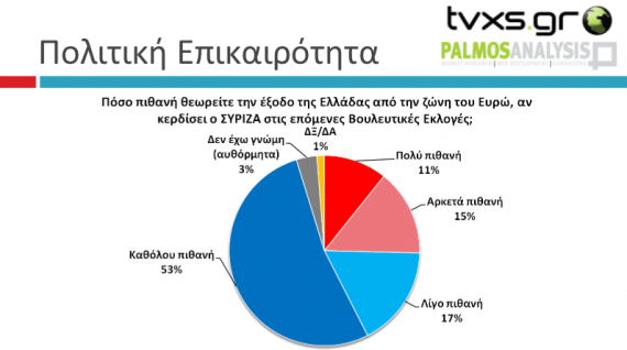 Μεγάλο ενδιαφέρον παρουσιάζει η ερώτηση για τον κίνδυνο του Grexit από το ευρώ, καθώς οι απαντήσεις περιορίζουν τις δυνατότητες επιτυχίας που θα είχε μια προεκλογική εκστρατεία στηριγμένη στη σχετική κινδυνολογία. Στην πλειοψηφία τους οι πολίτες δεν πιστεύουν ότι είναι πιθανή η έξοδος της Ελλάδας από το ευρώ σε περίπτωση που ο ΣΥΡΙΖΑ κερδίσει τις επόμενες βουλευτικές εκλογές. Το 53% δεν θεωρεί καθόλου πιθανή μια Grexit, ενώ λίγο πιθανή τη θεωρεί το 17%. Αντίθετα αρκετά πιθανή θεωρεί την έξοδο από το ευρώ σε περίπτωση που κυβερνήσει ο ΣΥΡΙΖΑ, το 15% και πιθανή το 11%.