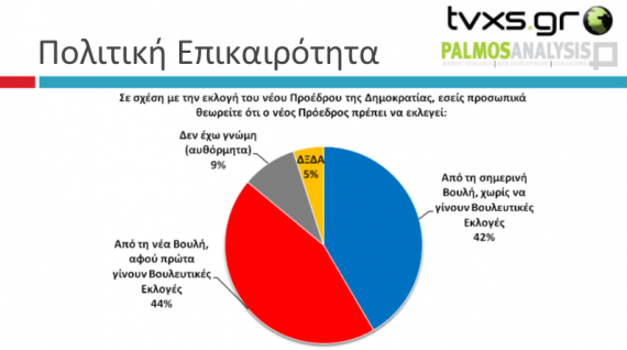Σε σχέση με την εκλογή του νέου Προέδρου της Δημοκρατίας οι ερωτηθέντες πιστεύουν σε ποσοστό 44% ότι πρέπει να εκλεγεί από νέα Βουλή αφού πρώτα προηγηθούν βουλευτικές εκλογές. Την ίδια ώρα, το 42% πιστεύει ότι ο Πρόεδρος της Δημοκρατίας πρέπει να προέλθει από τη σημερινή Βουλή, χωρίς να προηγηθούν βουλευτικές εκλογές.