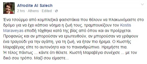 Η Αφροδίτη Αλ Σάλεχ χαρακτήρισε "κομπλεξικά φασιστάκια" εκείνους που εξέφρασαν τη διαφωνία τους με τις απόψεις του μουσικοσυνθέτη, σχολιάζοντας στην ανάρτηση του, ενώ υποστήριξε πως ο Κωστής Μαραβέγιας είπε "το αυτονόητο".