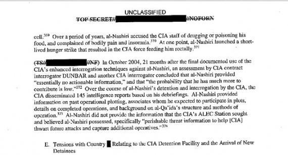 Η έκθεση περιγράφει μια μυστική φυλακή της CIA, η τοποθεσία της οποίας δεν αποκαλύπτεται, ως «μπουντρούμι» όπου οι κρατούμενοι κρατούνταν στο απόλυτο σκοτάδι, συνεχώς δεμένοι σε κελιά απομόνωσης, όπου τους βομβάρδιζαν με δυνατούς ήχους ή μουσική, ενώ είχαν στη διάθεσή τους μόνο έναν κουβά για τις σωματικές τους ανάγκες.