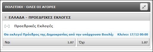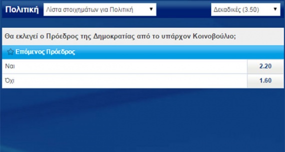 Μεγάλη διαδικτυακή εταιρεία στοιχηματισμού προσφέρει ίσες αποδώσεις, της τάξεως του 1.87, για το ενδεχόμενο να εκλεγεί ή όχι ανώτατος πολιτειακός άρχοντας από την παρούσα βουλή.