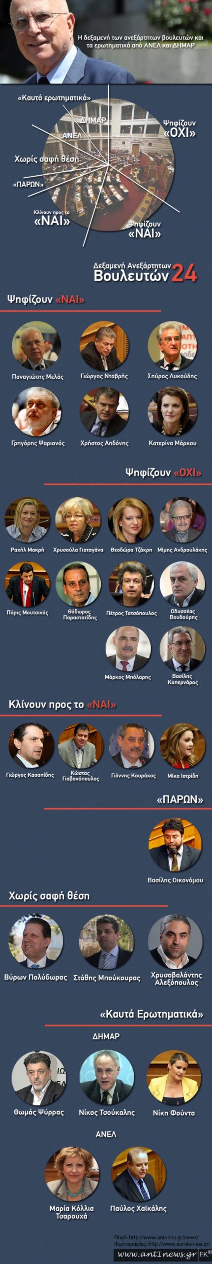 Το παρακάτω χαρακτηριστικό γράφημα από τον ΑΝΤ1 απεικονίζει τις προθέσεις των ανεξάρτητων βουλευτών για τη σημερινή πρώτη ψηφοφορία για τη εκλογή Πρόεδρου της Δημοκρατίας: