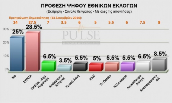Προβάδισμα 3,5 ποσοστιαίων μονάδων υπέρ του ΣΥΡΙΖΑ, καταγράφει δημοσκόπηση της Pulse για λογαριασμό του τηλεοπτικού σταθμού Action 24.