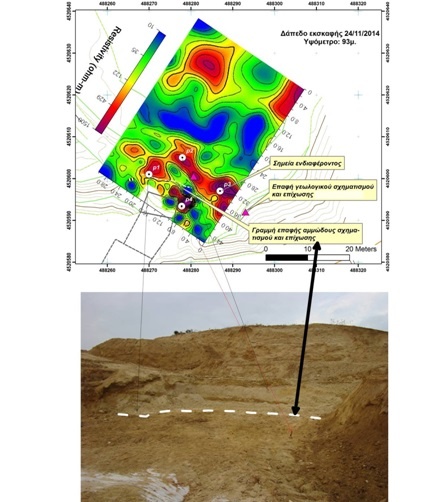 Η γεωφυσική διασκόπηση έδωσε απεικονίσεις του εσωτερικού του λόφου, όπου εντοπίστηκαν αντιστατικές δομές, οι οποίες διερευνήθηκαν περαιτέρω. Σε μία περίπτωση βόρεια της θόλου, η αφαίρεση των χωμάτων αποκάλυψε ότι η υπεδάφια δομή που απεικονίστηκε με τις ηλεκτρικές τομογραφίες ήταν φακός άμμου, δηλαδή φυσικός σχηματισμός. Η περίπτωση αυτή φαίνεται στο συνημμένο σχήμα. Στην οριζόντια τομογραφική απεικόνιση για υψόμετρο των 93μ., τα θερμά χρώματα δείχνουν τις περιοχές με υψηλή ειδική ηλεκτρική αντίσταση και αντίστοιχα τα ψυχρά χρώματα τις περιοχές με χαμηλή.