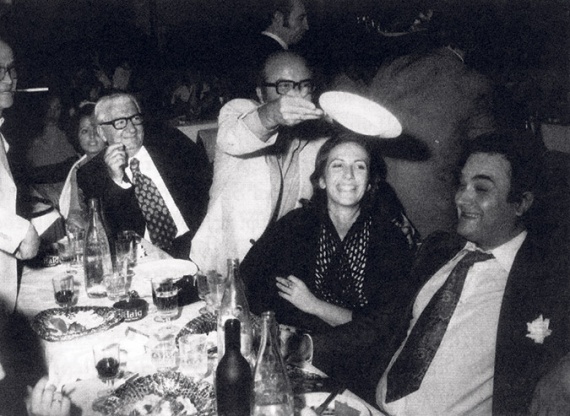 Νυχτερινή διασκέδαση συντροφιά με τον Δημήτρη Ψαθά, στο νυχτερινό κέντρο «Νεράιδα». Ο Κυρ σπάει ένα πιάτο για να δείξει στον Ψαθά ότι έχει άδικο να κατηγορεί τους «πιατάδες». Ορθιος αριστερά στην άκρη της φωτογραφίας ο Κίτσος Τεγόπουλος