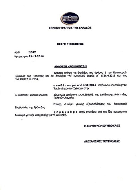Οι αντιδράσεις, οι γκρίνιες, τα σχόλια και οι μουρμούρες δεν ανατρέπουν τη δυναμική της Σύλβιας στην Εθνική Τράπεζα, ούτε αλλάζουν τις επιλογές της διοίκησης. Λέγεται μάλιστα ότι μετά το δημοσίευμα του «ΘΕΜΑτος» την περασμένη Κυριακή, η Σύλβια επέμενε ώστε να τακτοποιηθεί το θέμα της και να αναλάβει θέση στο οργανόγραμμα. Ετσι, στις 23 Δεκεμβρίου με την υπ’ αριθμ. 1017 πράξη της διοικήσεως, που υπογράφει ο Α. Τουρκολιάς, η κυρία Βασιλική-Σύλβια Κλιμάκη αναλαμβάνει αναδρομικά από 4/12/2014 καθήκοντα εποπτείας του τομέα Δημοσίων Σχέσεων καθώς και «δικαίωμα γενικής υπογραφής για τη Διοίκηση».