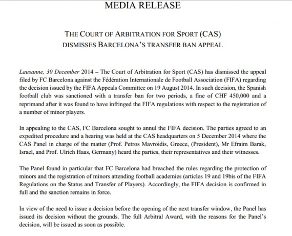 Απορρίφθηκε από το CAS η έφεση της Μπαρτσελόνα κατά της ποινής απαγόρευσης μεταγραφών μέσα στο 2015, που της είχε επιβάλει η FIFA. Από το 2016 πλέον θα μπορούν να ενισχυθούν οι «μπλαουγκράνα».