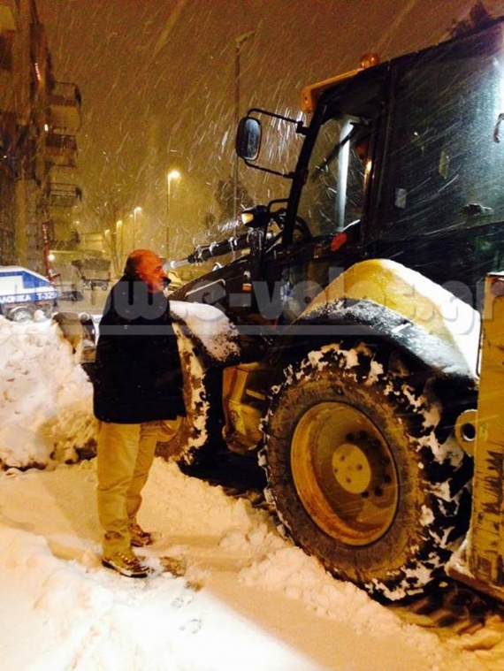 Αν και αργά το βράδυ, ο Αχιλλέας Μπέος, βρέθηκε στο πλευρό των συνεργείων που προσπαθούσαν να απομακρύνουν τα χιόνια από τους δρόμους του Βόλου.