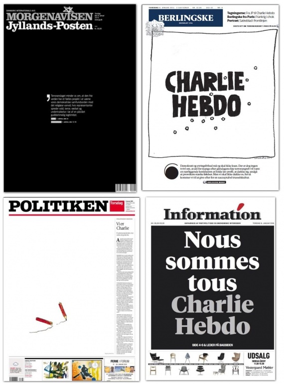 Στη σημερινή έντυπη έκδοση της Berlingske, η οποία ήταν διαθέσιμη χθες το βράδυ στην ηλεκτρονική της μορφή, η εφημερίδα αναδημοσιεύει πολλά παλαιότερα πρωτοσέλιδα της Charlie Hebdo, μεταξύ των οποίων ένα με τον προφήτη Μωάμεθ κι ένα άλλο σχετικό με το νόμο της σαρία.